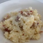 1 litro de caldo de pollo + 300 g de arroz + 1 cebolla pequeña + 5 lonchas de jamón serrano (aprox 100g) + 60g queso parmesano rallado + AOVE