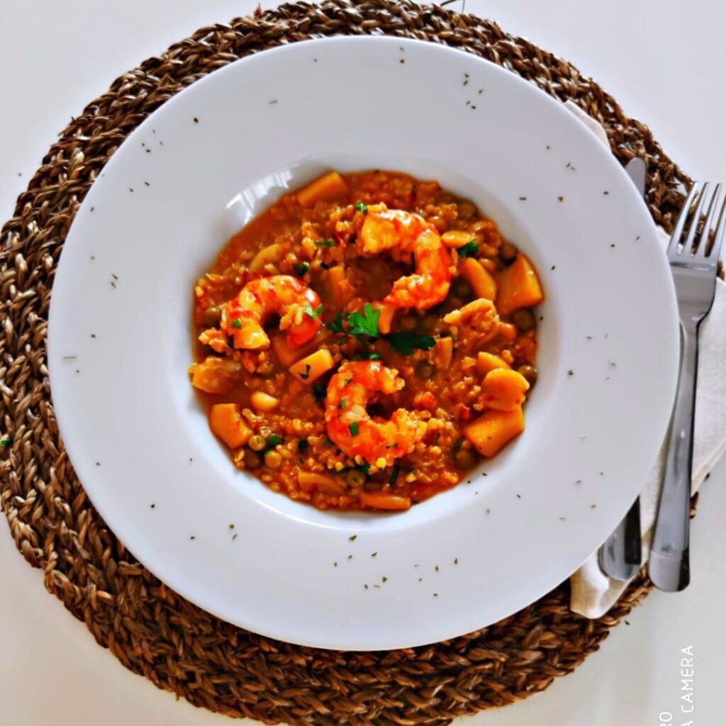 ✔️INGREDIENTES FUMET:🔺250g de gambones crudos enteros🔺5g de AOVE🔺600g de agua🔺1 cucharadita de sal ✔️INGREDIENTES ARROZ INTEGRAL CON SEPIAS Y GAMBONES:🔺10g