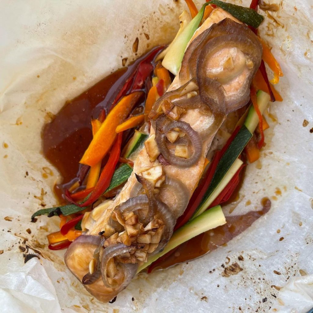 🌱INGREDIENTES ☑️Lomo de salmón ☑️Verduras al gusto ☑️1 diente de ajo ☑️1 cucharada de salsa de soja 🌱PREPARACIÓN 🔺Precalentamos el