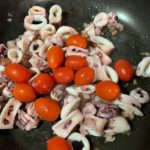 - Una vez la cebolla esté dorada, añadimos el calamar cortado, las gambas y los tomates.