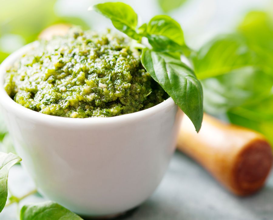El pesto casero es una excelente fuente de grasas saludables, principalmente provenientes del aceite de oliva virgen extra, que ayuda a mantener la salud cardiovascular al reducir los niveles de colesterol LDL (el colesterol «malo»). Además, el pesto está lleno de antioxidantes gracias a ingredientes como la albahaca y los piñones.